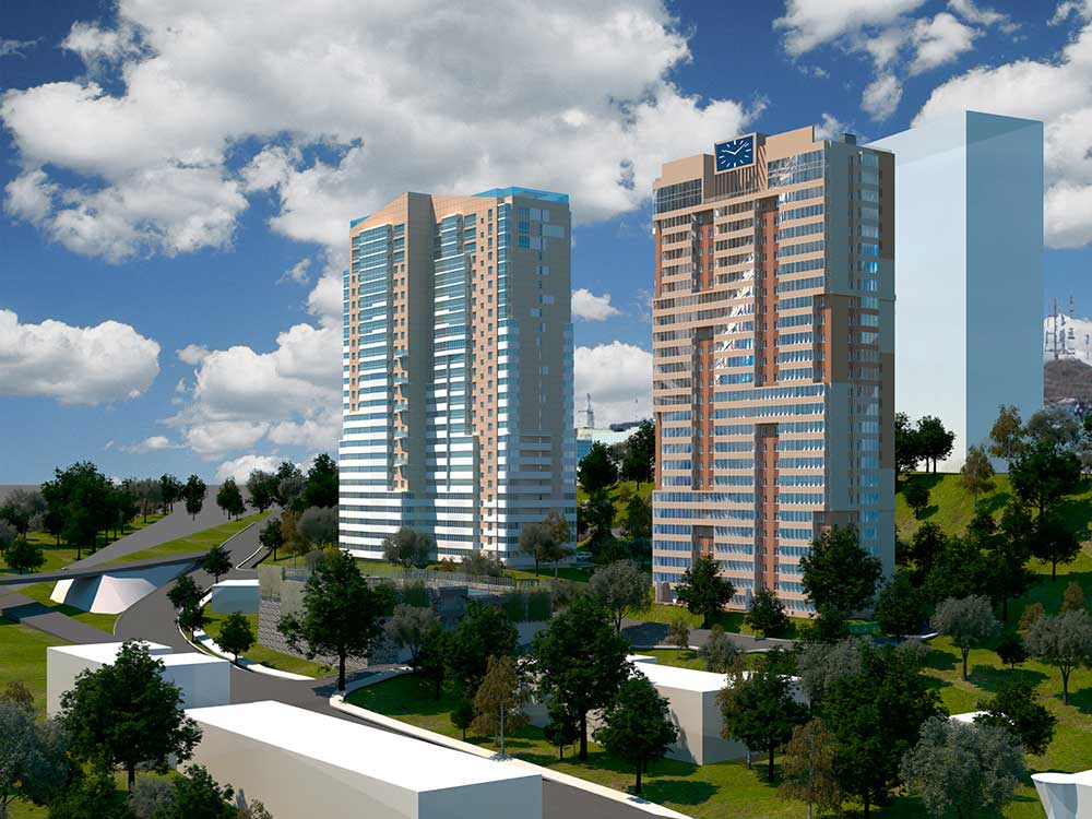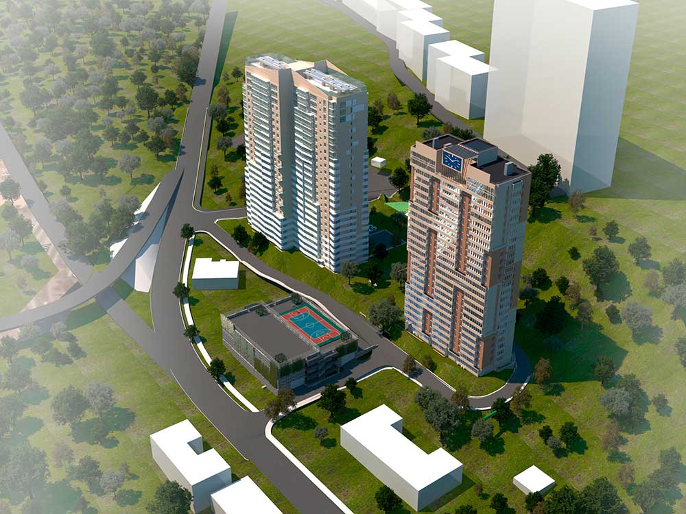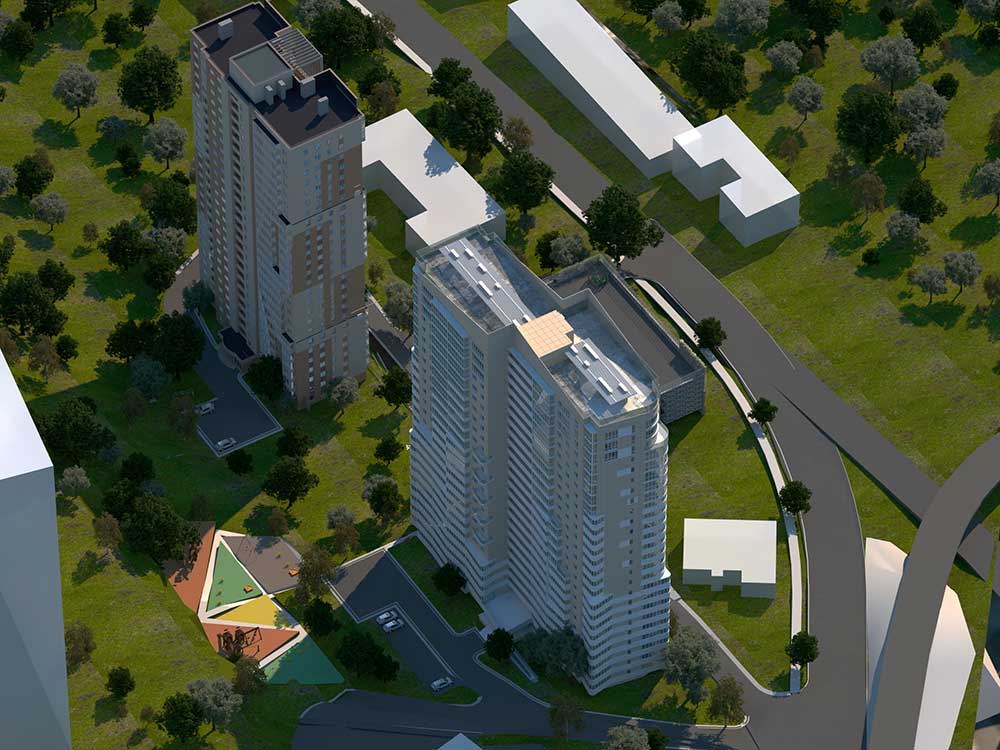 Проект 25 этажного 263 квартирного жилого дома относится к категории жилья класса "комфорт" (между "эконом" и "бизнес" классами). Проектируемое здание имеет простую геометрическую форму, близкую к прямоугольной, с размерами в осях 61,35 х 23,10 м. Композиционные и объемно-планировочные решения, принятые в проекте определились градостроительной ситуацией, рельефом участка и функцией здания. Жилой дом коридорного типа, широтной ориентации, состоит из двух блоков (5-6 квартир на этаже), соединенных лестнично-лифтовым узлом. Общее количество квартир - 263.