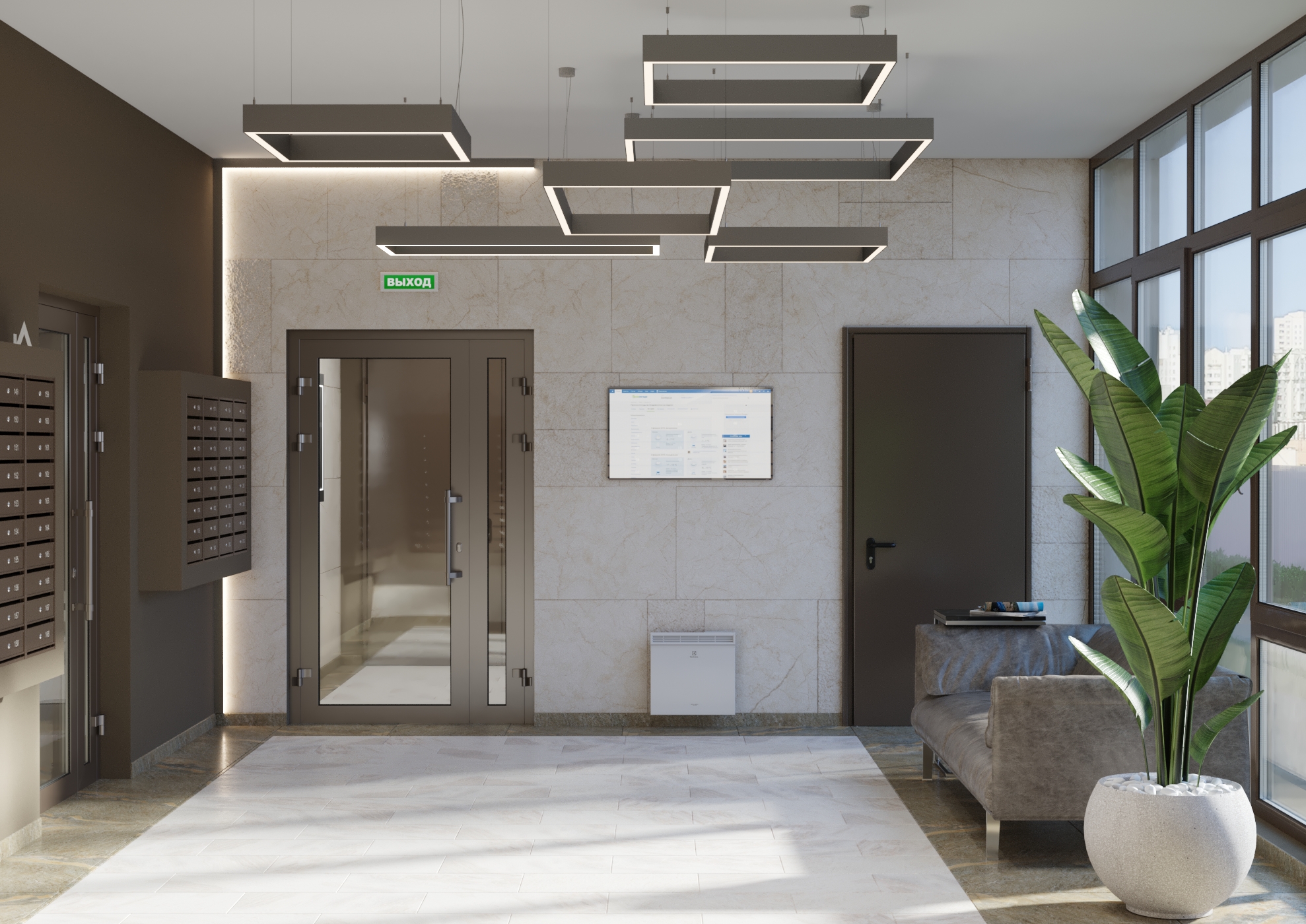 Наружные стены – ж/б монолит, кладка из керамического кирпича, с последующим утеплением и устройством навесного вентилируемого фасада с отделкой керамогранитом. Так же на фасаде предусмотрены «декоративные» корзины для размещения в них внешнего блока кондиционера.