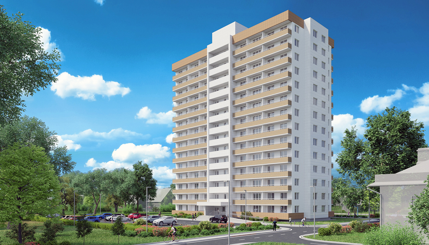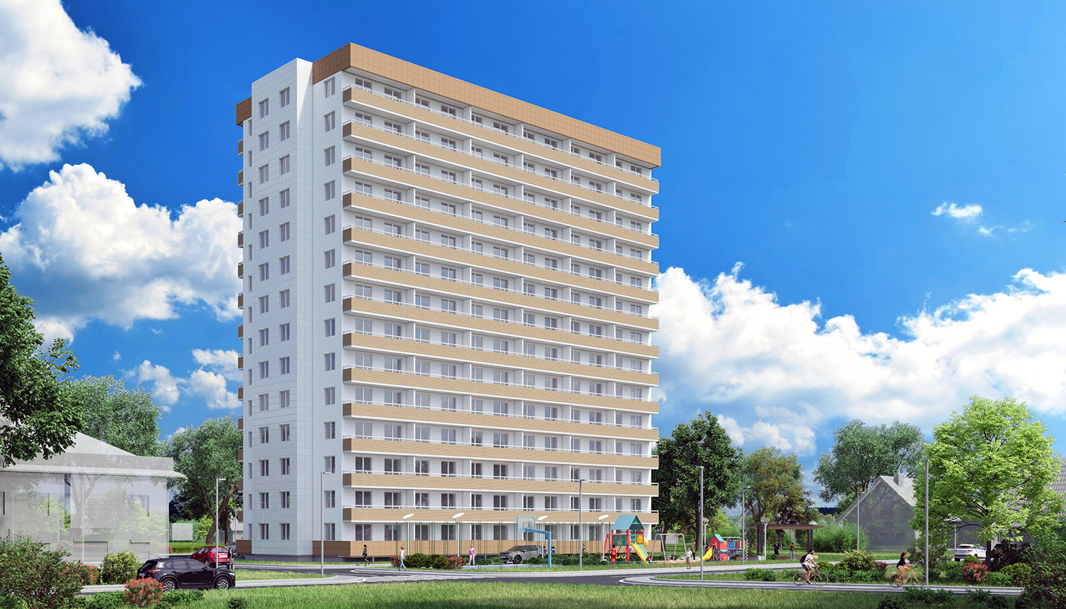 Дом имеет 14 жилых этажей, на каждом из которых проектом предусмотрено 12 квартир площадью от 33 до 56 кв.м